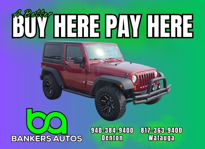 Thank you for checking out our 2011 Jeep Wrangler. At Bankers Autos, we pride ourselves on offering high quality pre-owned vehicles like this Jeep. Our B.A. mission is to provide GOOD CARS to GOOD PEOPLE just like you! We specialize in Buy Here Pay Here financing. If you have no credit, or some bad credit, you have come to the right place. Bankers Autos is focused on where you are now and trying to help you MOVE FORWARD! We report to Experian and Equifax to help you rebuild your credit! We care about the person first, the car deal second. Bankers Autos stocks inventory like this Wrangler with affordable prices and payments as a top priority. Please call us at 940-384-9400 (Denton) or 817-363-9400 (Watauga) to discuss your unique needs and situation. We look forward to serving you!
